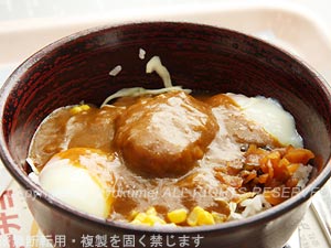 ハンバーグと温泉卵2個、千切りキャベツ、コーンにカレーがかかっています。