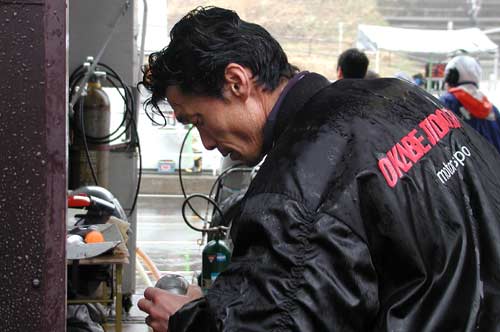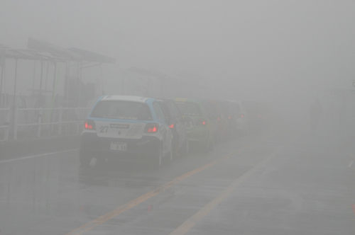 天気は雨がおさまって来たと思うと霧が濃くなり、 霧が晴れてきたと思うと大雨という、どうしようもない天気。 レースが中止になってもおかしくないとまで思われましたが、 なんとか13時05分、レーススタート。